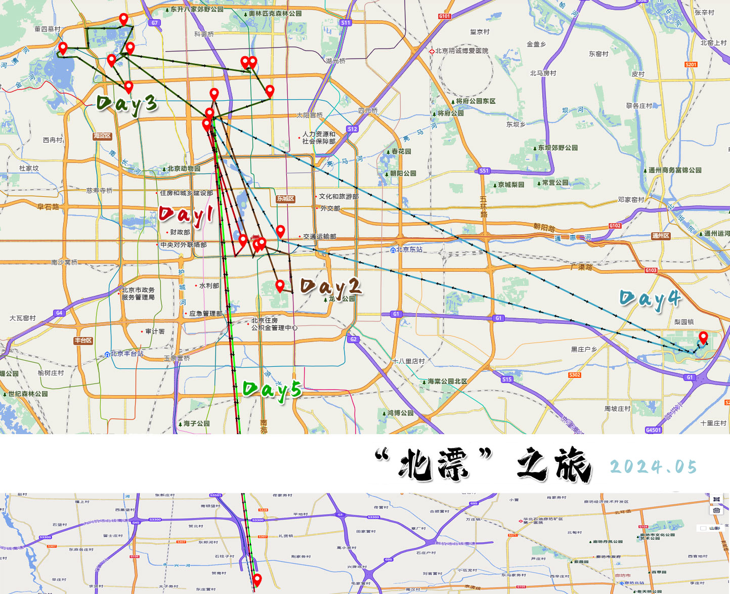 Day04(5.3), 8:00-8:30 北太平庄-园明园站 9:00-10:00 1h 清华西门、北大西门(打卡) 10:00-11:00 1h 海淀区新华书店(早餐) 11:30-14:30 3h 颐和园(东门进、北门出) 15:00-17:00 2h 圆明园 17:30-19:00 1.5h 奥体公园(水立方、鸟巢) 19:30-20:30 1h 安贞桥环宇荟(晚餐) 21:00-22:00 1h 安贞桥-中梦立方酒店 22:00 休息